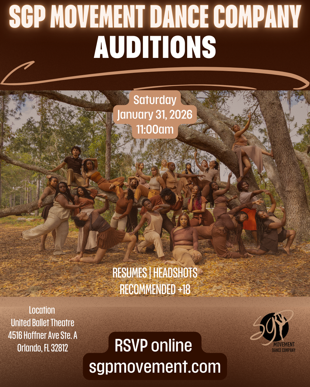 SGP MOVEMENT DANCE COMPANY IS moving into THEIR 5TH season, with great things ahead. Please rsvp to secure your spot. headshots and resumes are recommended. If you are unable to attend, please reach out to the director on video submission details.